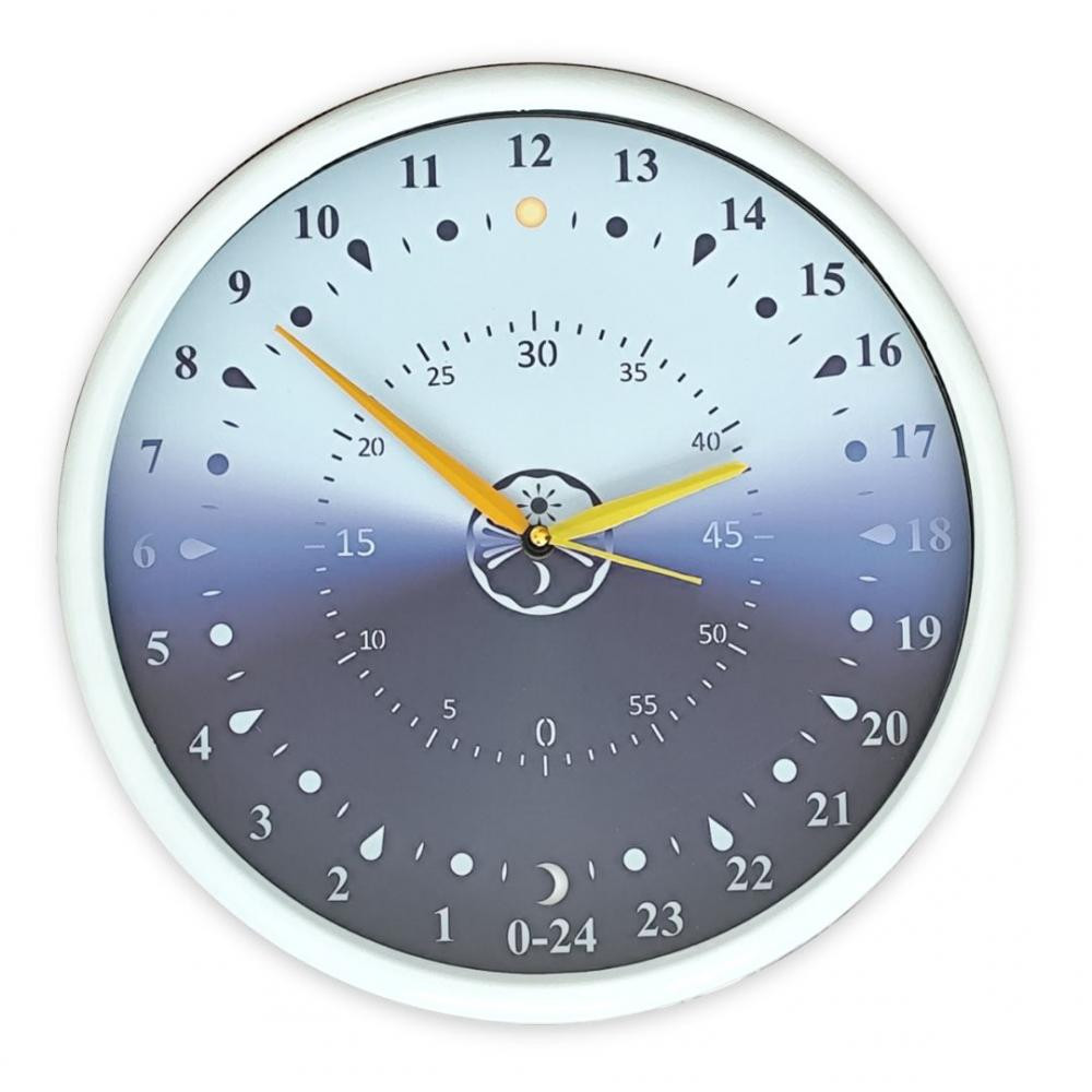 Ez az óra a természetes haladás normál ritmusában jeleníti meg a nappal és az éjszaka egységét, úgy, ahogyan azt a természetben is megtapasztalhatjuk – ahogyan azt minden élőlény ösztönösen érzékeli. A háttér színeiben a kék árnyalatai a nappal világosságától az éjszaka sötétjéig vezetnek, finoman átmenettel színezve a hajnal és az alkony perceit is. Ez is emlékeztet minket arra, hogy az idő nemcsak mérhető számokból áll, hanem változó hangulatú, élő minőség, mely más-más hatású biológiánkra.