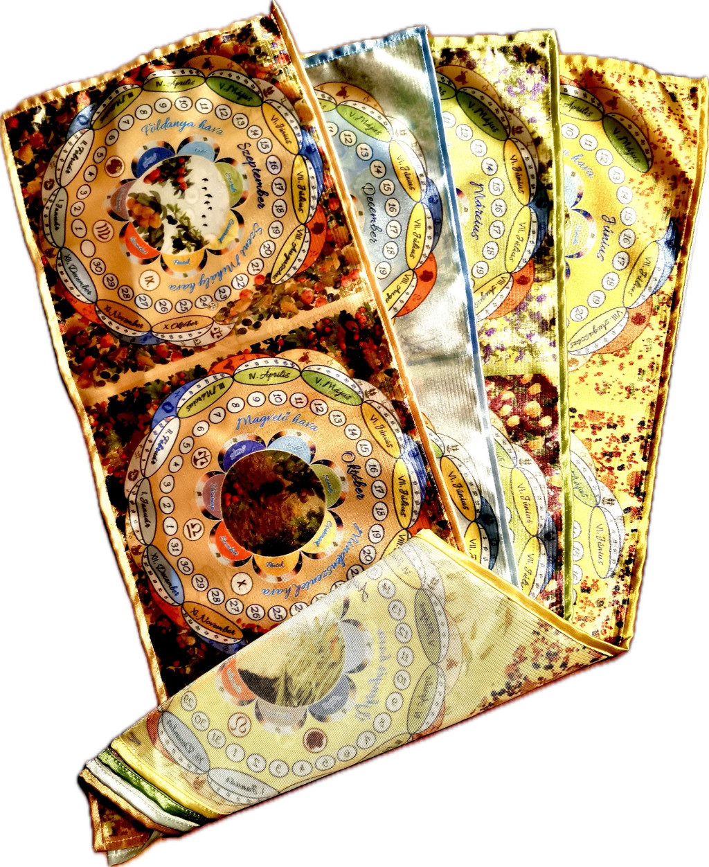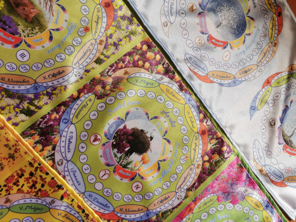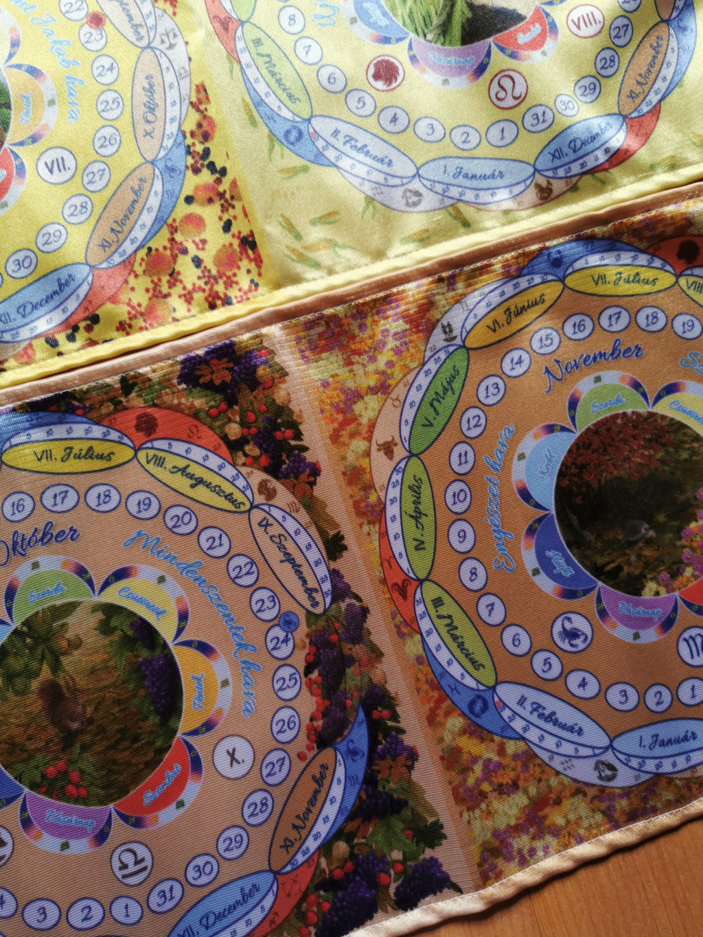 Ez a díszterítő nemcsak vizuálisan különleges, hanem időutazásra is hív: a hónapok háromféle névvel szerepelnek rajta, melyek a magyar nyelv gazdagságát és a természethez fűződő kapcsolatunkat idézik meg. A ma ismert elnevezések melletti hónapnevek a korábbi magyar nyelvhasználatból erednek, és természeti jelenségekre, népszokásokra vagy vallási ünnepekre utalnak.
