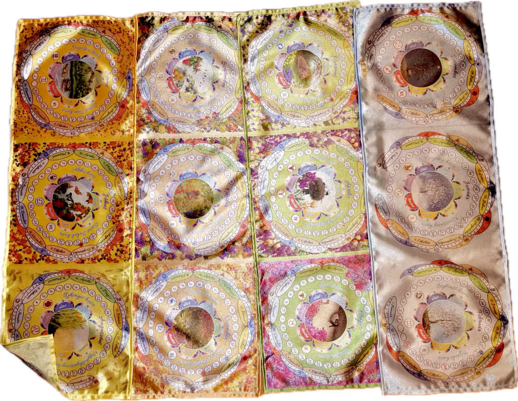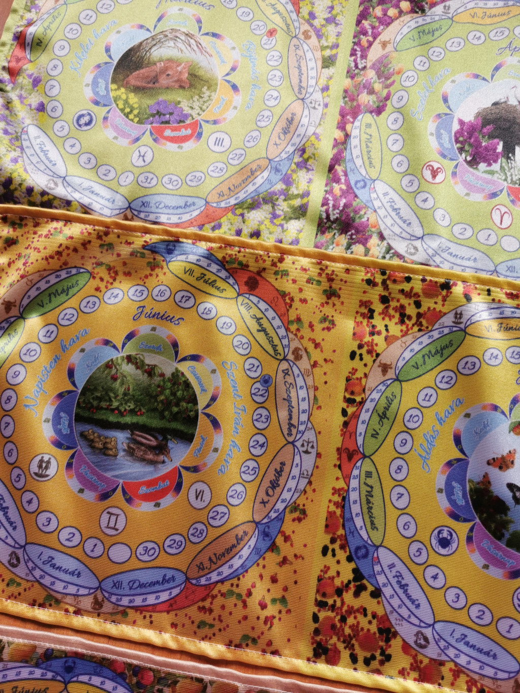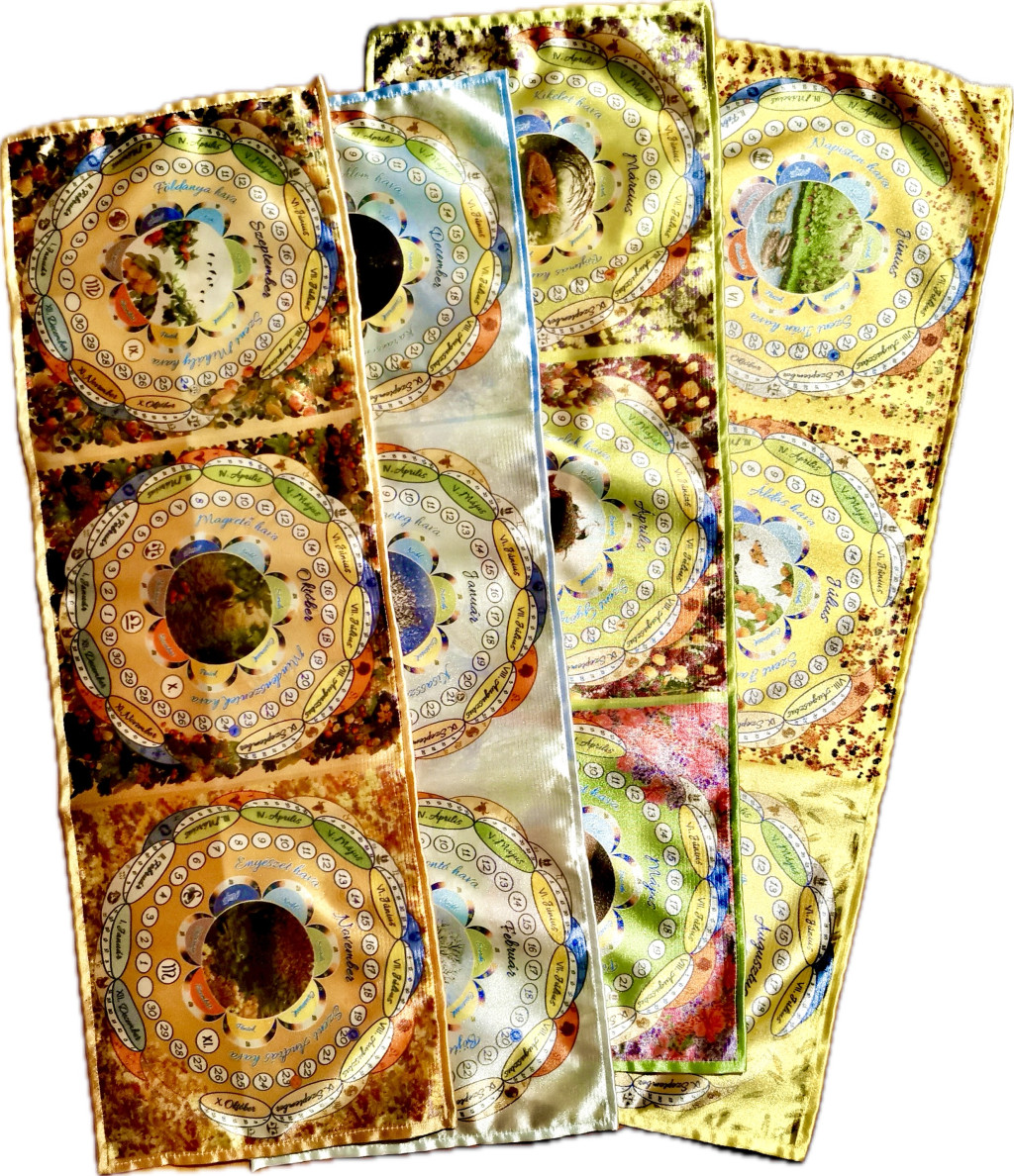 Ez a díszterítő nemcsak vizuálisan különleges, hanem időutazásra is hív: a hónapok háromféle névvel szerepelnek rajta, melyek a magyar nyelv gazdagságát és a természethez fűződő kapcsolatunkat idézik meg. A ma ismert elnevezések melletti hónapnevek a korábbi magyar nyelvhasználatból erednek, és természeti jelenségekre, népszokásokra vagy vallási ünnepekre utalnak.